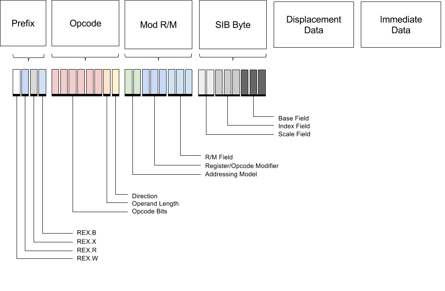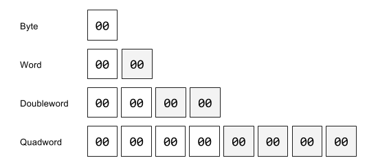 The x86-x64 instruction set is the 64-bit revision of x86 instruction set which was first developed for the Intel 8086 CPU family. The base types which hardware operates over are integers and floating point types. Let us just consider the integral types for now, these come in four major varieties: