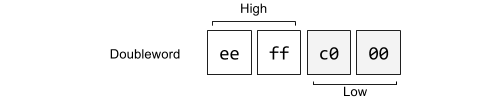 On the Intel architecture numbers are represented little endian meaning lower significant bytes are stored in lower memory addresses. The whole memory representation for a value is partitioned into high bits and low bits. For example the hexadecimal number 0xc0ffee